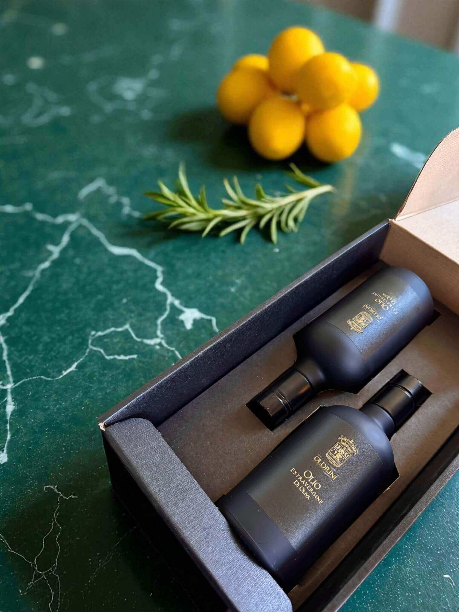 All’interno, due bottiglie di Olio Extravergine IGP Toscano Biologico adagiate su un supporto su misura. È la soluzione ideale per un regalo importante, per ringraziare un cliente speciale o per celebrare un’occasione. Non state regalando solo olio, state regalando un pezzo di Toscana vestito da sera.